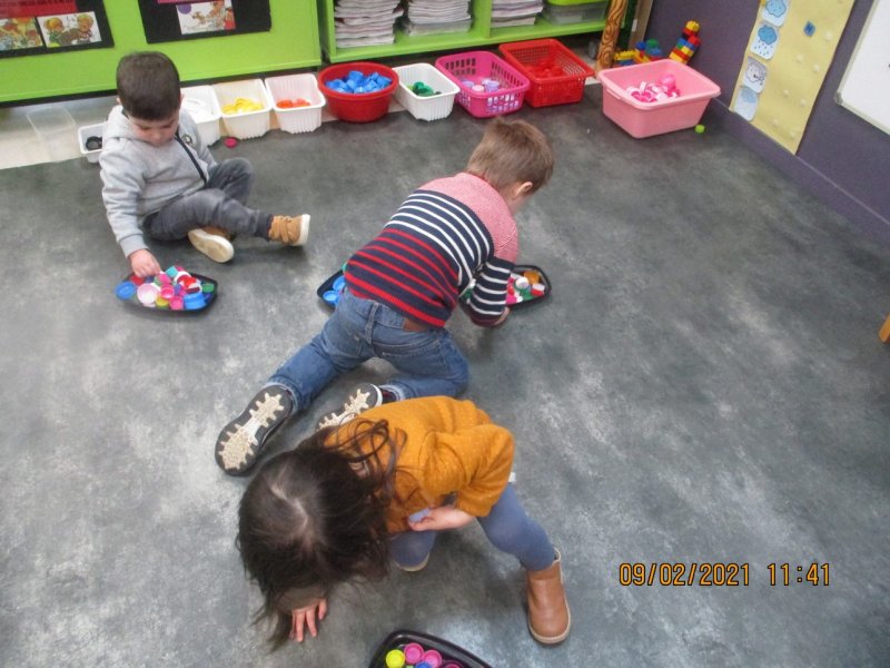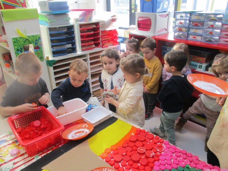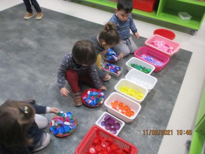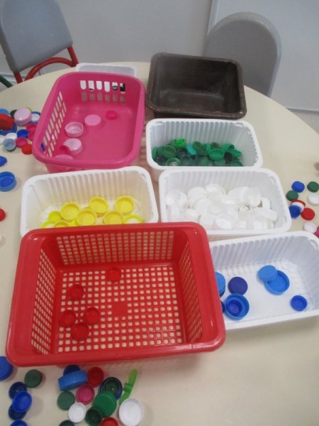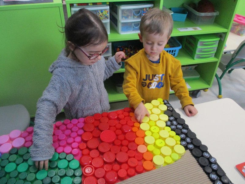 Dans le cadre du projet du tri sélectif des déchets dans la classe, les enfants de petite section ont récolté de nombreux bouchons plastiques de toutes les couleurs.