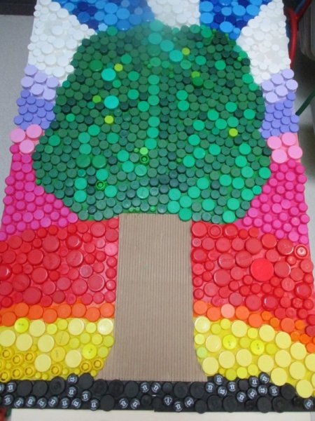 Afin de valoriser le recyclage de ces derniers, les enfants ont réalisé collectivement une fresque multicolore dont le sujet central est l’arbre dans la nature.