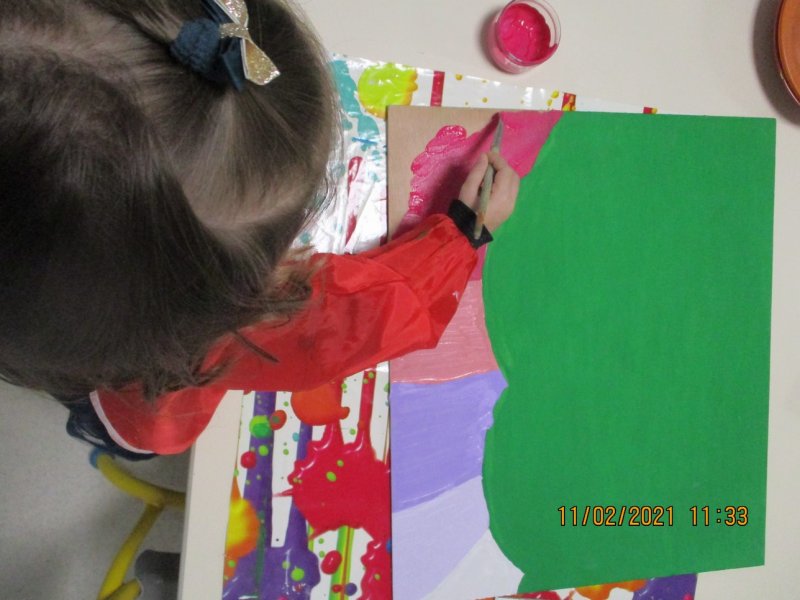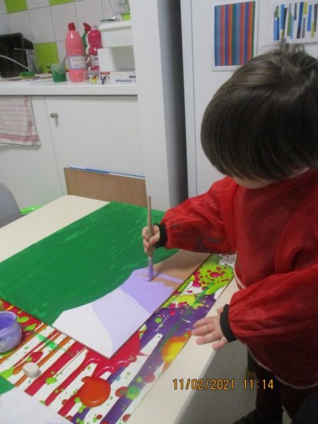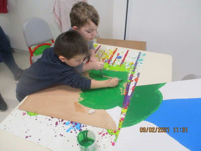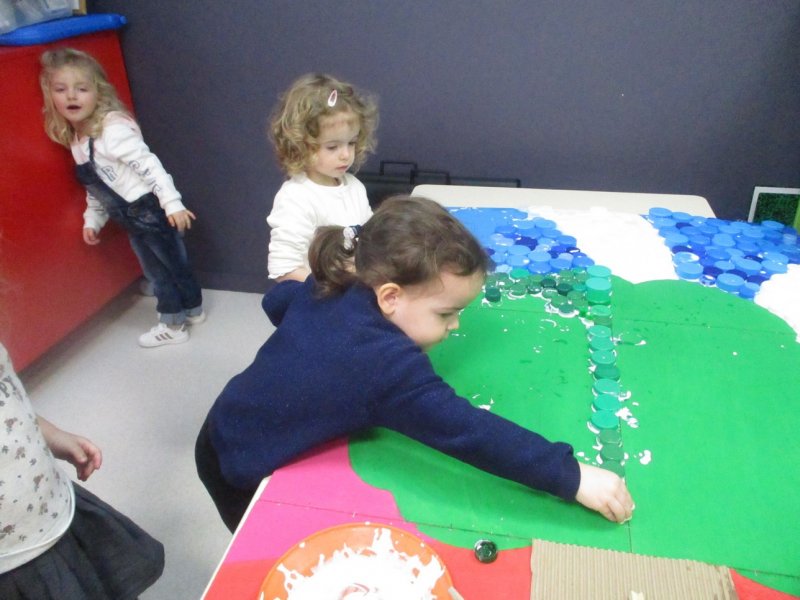 Enfin ils ont collé les bouchons sur le support en respectant le code de couleurs : “je colle les bouchons verts sur la zone peinte en vert”…