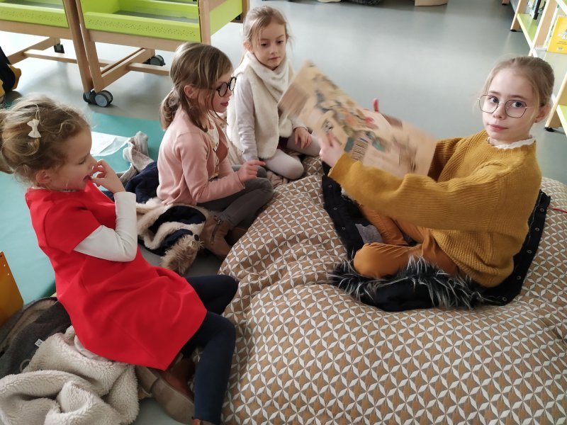 Chaque semaine, une dizaine de CM2 se rend à la bibliothèque de l’école pour une activité de lecture avec les élèves de Grande Section. Les enseignantes de GS sélectionnent des albums de jeunesse adaptés. Les CM2 préparent cette lecture en s’entraînant à lire à haute voix de manière expressive.  Ils créent aussi des questions de compréhension et une activité sur le titre.