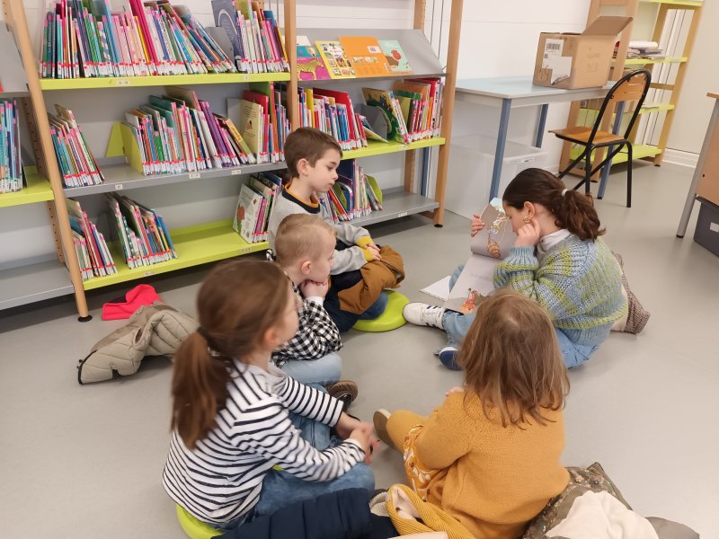Chaque semaine, une dizaine de CM2 se rend à la bibliothèque de l’école pour une activité de lecture avec les élèves de Grande Section. Les enseignantes de GS sélectionnent des albums de jeunesse adaptés. Les CM2 préparent cette lecture en s’entraînant à lire à haute voix de manière expressive.  Ils créent aussi des questions de compréhension et une activité sur le titre.