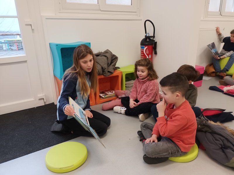 Chaque semaine, une dizaine de CM2 se rend à la bibliothèque de l’école pour une activité de lecture avec les élèves de Grande Section. Les enseignantes de GS sélectionnent des albums de jeunesse adaptés. Les CM2 préparent cette lecture en s’entraînant à lire à haute voix de manière expressive.  Ils créent aussi des questions de compréhension et une activité sur le titre.