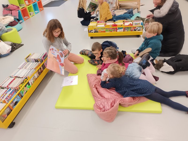 Chaque semaine, une dizaine de CM2 se rend à la bibliothèque de l’école pour une activité de lecture avec les élèves de Grande Section. Les enseignantes de GS sélectionnent des albums de jeunesse adaptés. Les CM2 préparent cette lecture en s’entraînant à lire à haute voix de manière expressive. Ils créent aussi des questions de compréhension et une activité sur le titre.