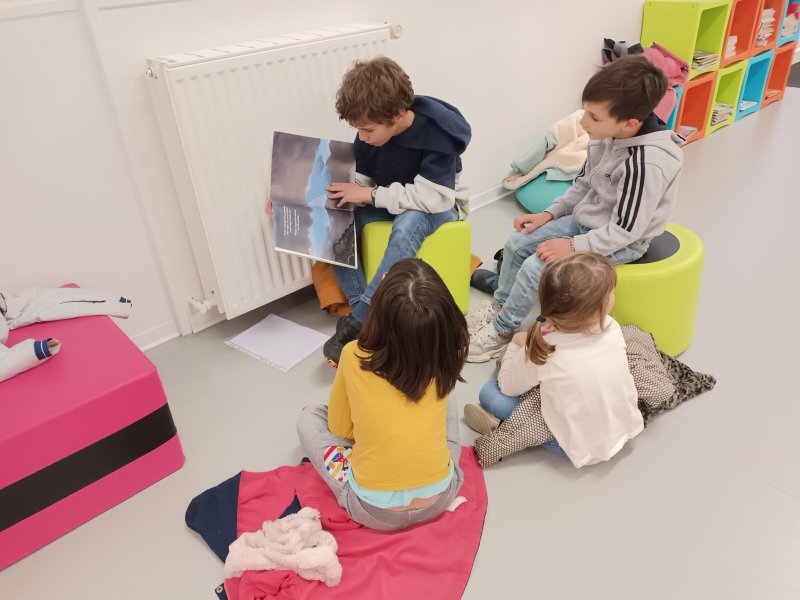 Chaque semaine, une dizaine de CM2 se rend à la bibliothèque de l’école pour une activité de lecture avec les élèves de Grande Section. Les enseignantes de GS sélectionnent des albums de jeunesse adaptés. Les CM2 préparent cette lecture en s’entraînant à lire à haute voix de manière expressive.  Ils créent aussi des questions de compréhension et une activité sur le titre.