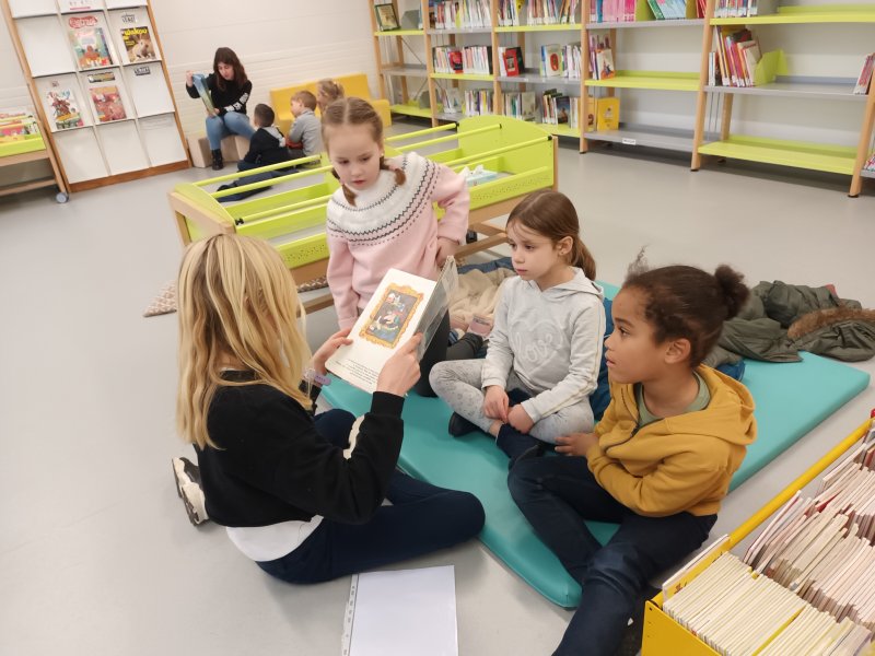 Chaque semaine, une dizaine de CM2 se rend à la bibliothèque de l’école pour une activité de lecture avec les élèves de Grande Section. Les enseignantes de GS sélectionnent des albums de jeunesse adaptés. Les CM2 préparent cette lecture en s’entraînant à lire à haute voix de manière expressive. Ils créent aussi des questions de compréhension et une activité sur le titre.