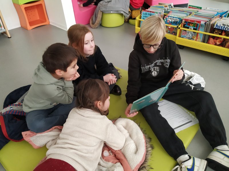 Chaque semaine, une dizaine de CM2 se rend à la bibliothèque de l’école pour une activité de lecture avec les élèves de Grande Section. Les enseignantes de GS sélectionnent des albums de jeunesse adaptés. Les CM2 préparent cette lecture en s’entraînant à lire à haute voix de manière expressive.  Ils créent aussi des questions de compréhension et une activité sur le titre.