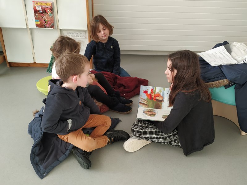 Chaque semaine, une dizaine de CM2 se rend à la bibliothèque de l’école pour une activité de lecture avec les élèves de Grande Section. Les enseignantes de GS sélectionnent des albums de jeunesse adaptés. Les CM2 préparent cette lecture en s’entraînant à lire à haute voix de manière expressive.  Ils créent aussi des questions de compréhension et une activité sur le titre.