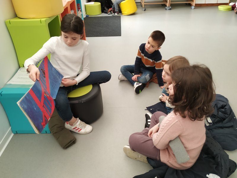 Chaque semaine, une dizaine de CM2 se rend à la bibliothèque de l’école pour une activité de lecture avec les élèves de Grande Section. Les enseignantes de GS sélectionnent des albums de jeunesse adaptés. Les CM2 préparent cette lecture en s’entraînant à lire à haute voix de manière expressive.  Ils créent aussi des questions de compréhension et une activité sur le titre.
