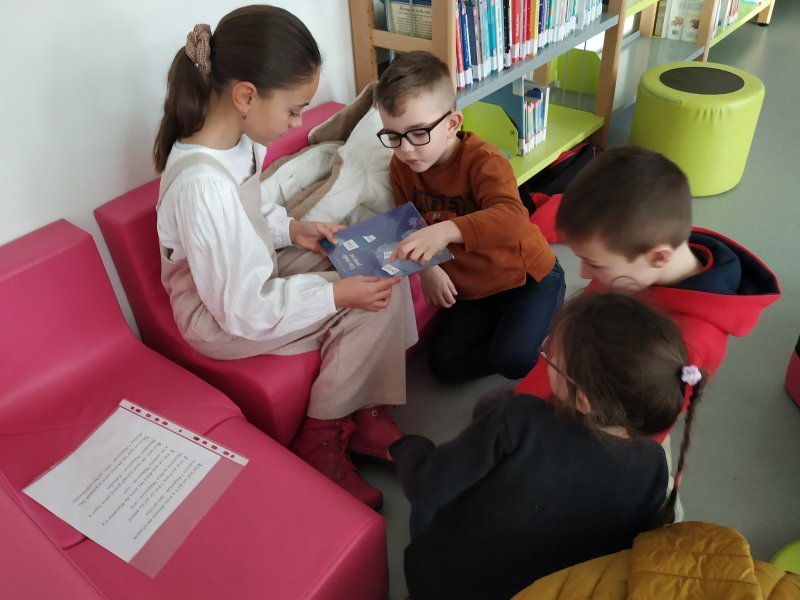 Chaque semaine, une dizaine de CM2 se rend à la bibliothèque de l’école pour une activité de lecture avec les élèves de Grande Section. Les enseignantes de GS sélectionnent des albums de jeunesse adaptés. Les CM2 préparent cette lecture en s’entraînant à lire à haute voix de manière expressive.  Ils créent aussi des questions de compréhension et une activité sur le titre.