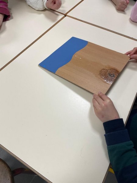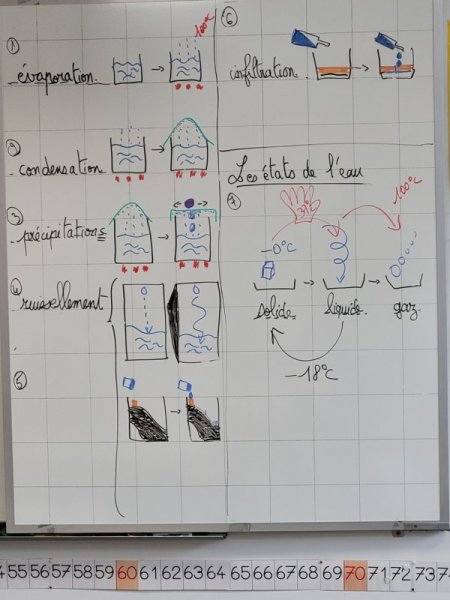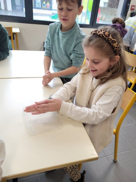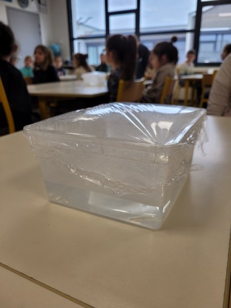 Après l’histoire, place aux expériences ! Les élèves ont réalisé plusieurs manipulations pour reproduire et observer les différentes étapes du cycle de l’eau : l’évaporation, la condensation, les précipitations, l’infiltration, le ruissellement.